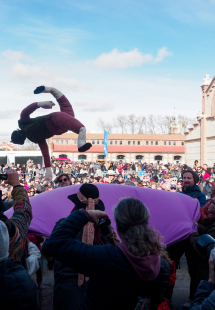 El manteo del pelele es una de las estampas más típicas del carnaval madrileño. Un muñeco de trapo ha volado sobre la manta al ritmo de coplas satíricas y melodías tradicionales en una ceremonia conducida por el grupo Arrabel, formado por 15 músicos vestidos con trajes tradicionales. Desde el escenario, guitarras, laúdes, bandurrias, dulzainas y percusión han puesto música a los llamados ‘cantos de peleles’, mientras el público a pie de plaza se sumaba al manteo y a los bailes en rueda.